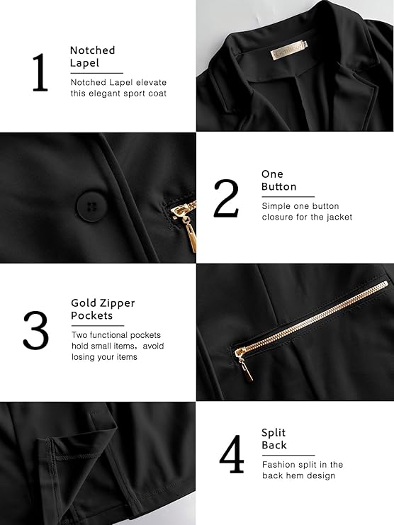 - ★Classic Design: Open front with a single front button, long sleeve, solid color/plain, fashion available gold zipper pockets, a split in the middle of the back hem, slim fit style